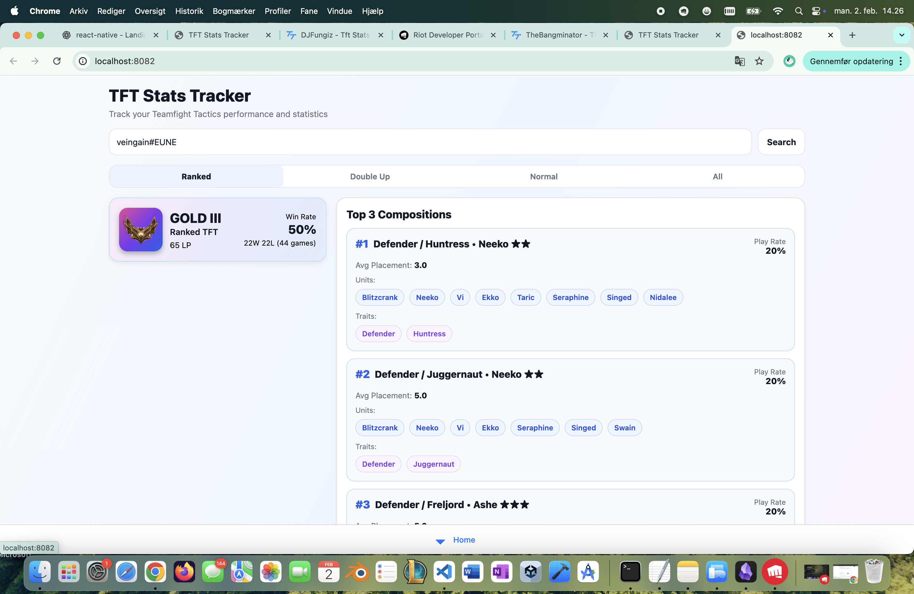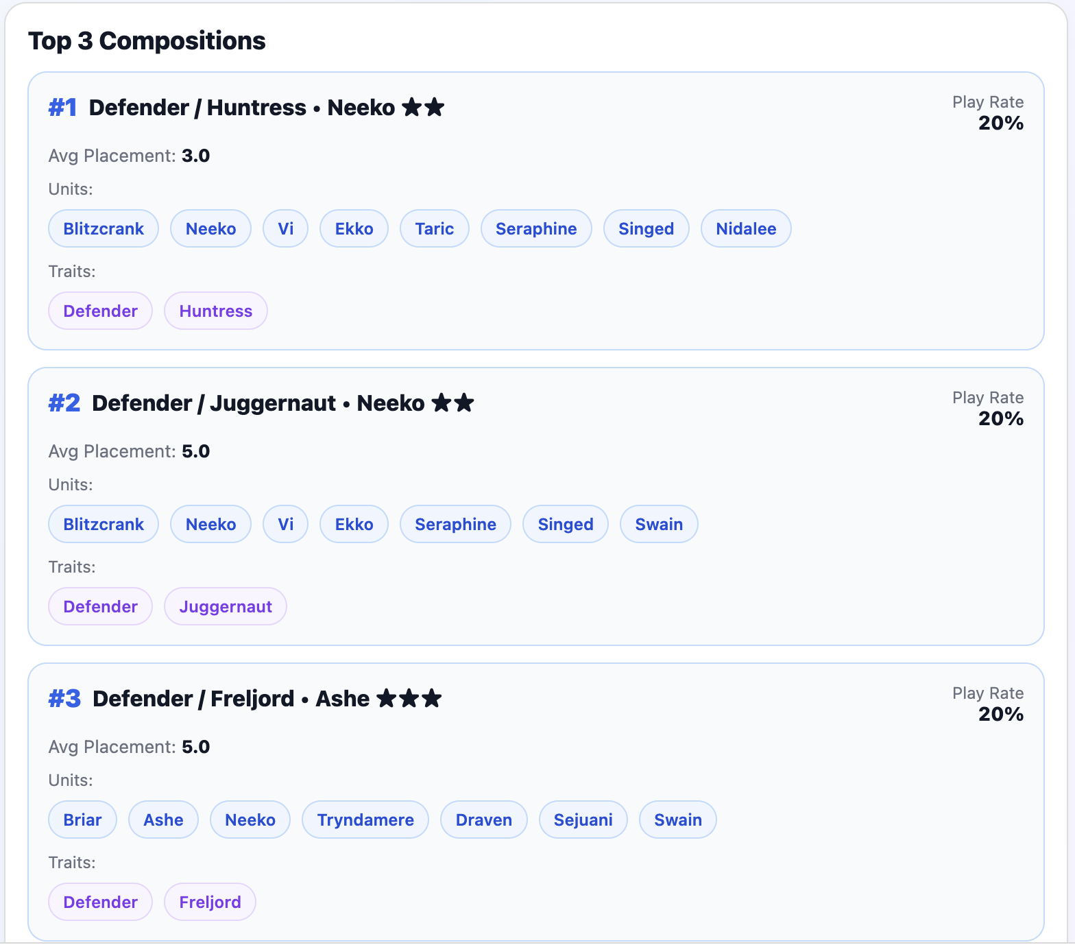 Your most played comps with average placement and play rate.